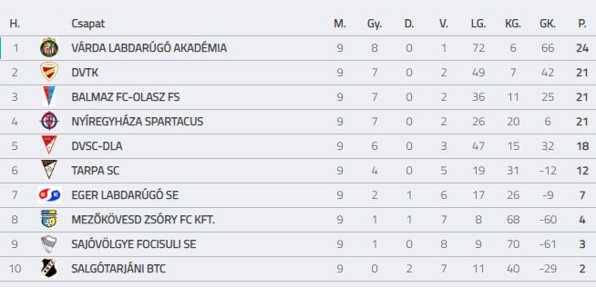Az U13-as bajnokság Észak-Keleti csoportjának állása az őszi szezon után